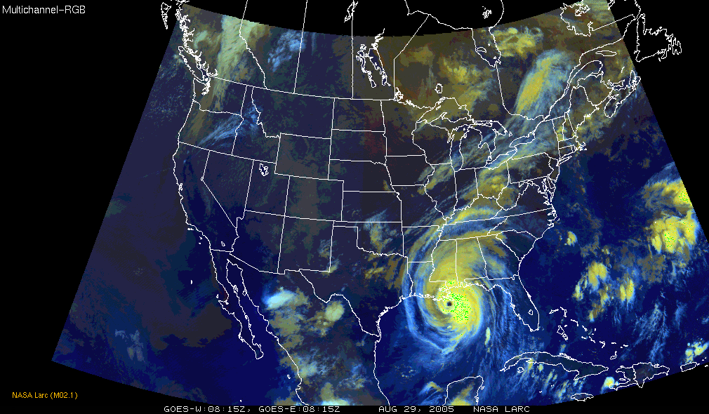 A multi-chanel merged GOES10 and GOES12 shows a Cat 5 hurricane, Katrina, making landfall on the Gulf Coast