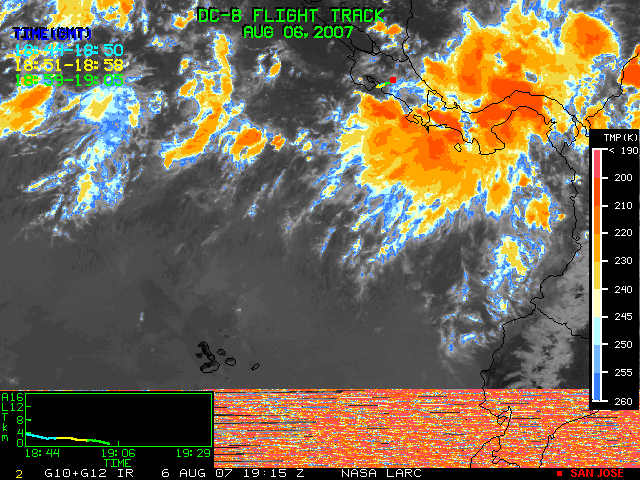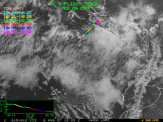 GOES (G10+G12) Visible image (06 August 2007 15:28 UTC) showing DC8 flight track