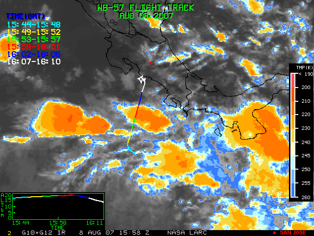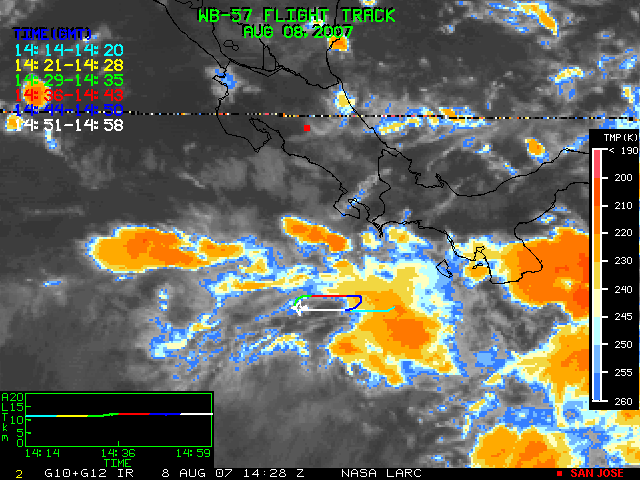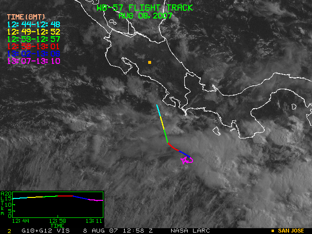 GOES (G10+G12) Visible image (08 August 2007 14:28 UTC) showing WB57 flight track